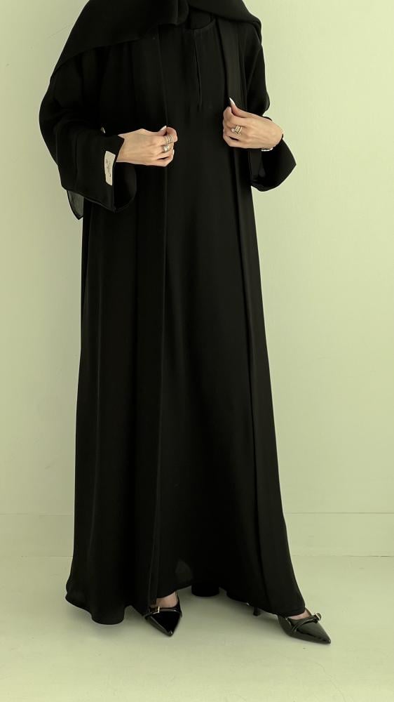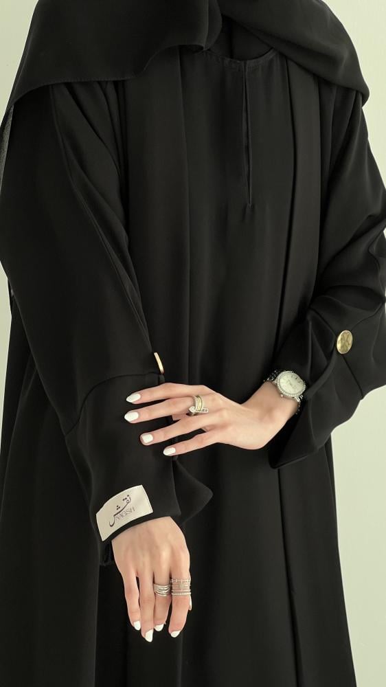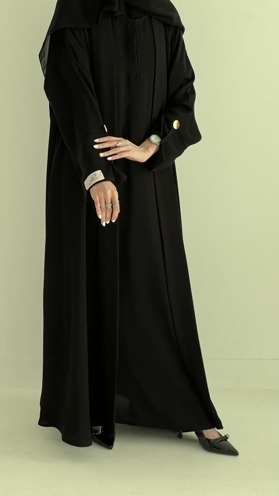 القماش : كريب إنترنت كويتي ، يتميز بسواده الفاحم ، خفيف بارد للصيف ، ويأتي مع قطعة داخلية كاملة وغير منفصلة